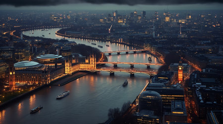 Generative AI : Aerial panoramic view to the lit Tower Bridge and skyline of London UK along the Thames river during dusk time
