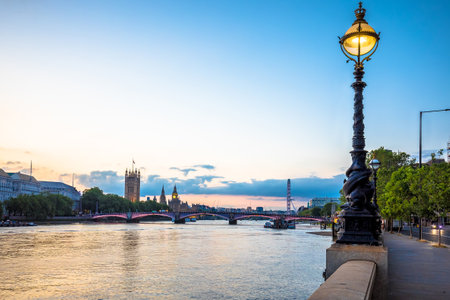 Bigh Ben and Thames riverfront sundown view in London, capital of United Kingdom
