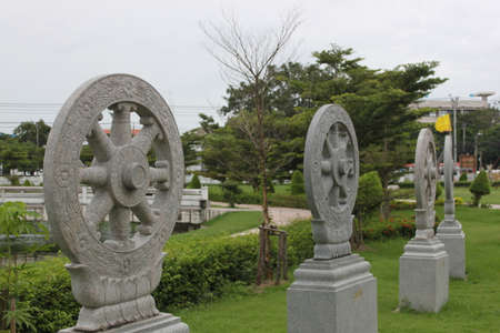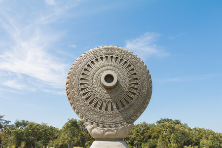 Carved stone Dhammajak at Buddhamonthon in Bangkok, Thailand