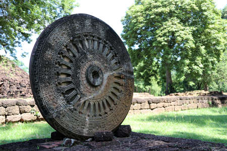 Stone carving of the wheel of the dharma. in archaeological site of Srithep ancient town in Petchaboon, Thailand. The influence of ancient Draravati culture, 8th-9th century A.D.