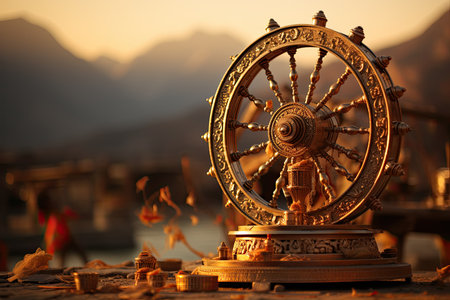 Wheel of prayers spinning gently in the wind in serene scenario., generative AI
