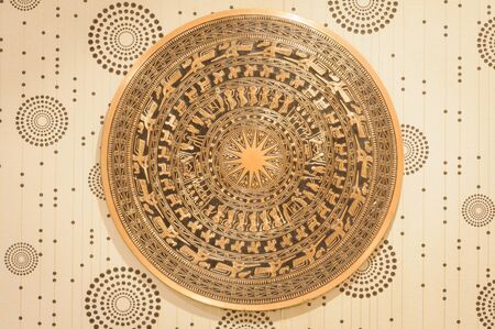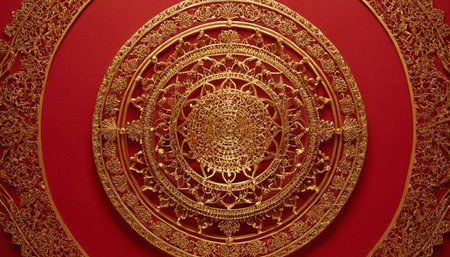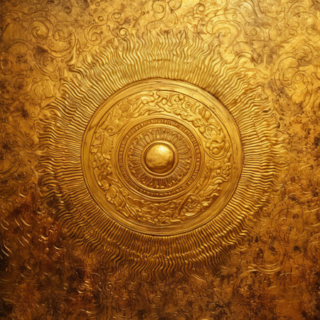 a gold carved metal sun disc, created by the master of goldsmithing ete, showcases intricate background elements in the style of traditional oil painting. this cambodian art piece exhibits visual texture abstraction, skillful lighting, and a heavy impasto texture. the high-quality photo captures the exquisite craftsmanship and attention to detail. ai generated