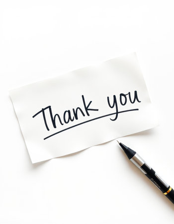 Gratitude expressed with a handwritten note on paper beside a black pen