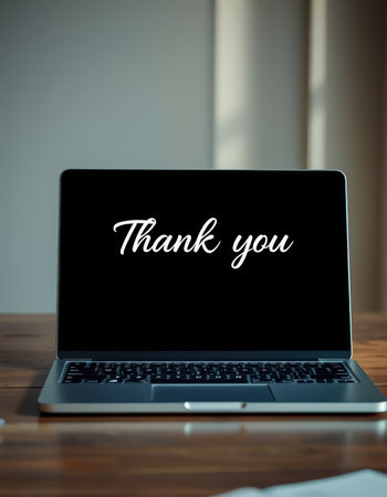 Thank you message displayed on laptop in cozy indoor workspace setting