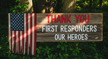 This image features a wooden sign with a patriotic theme. The sign has an American flag on the left side and the words 'Thank You First Responders Our Heroes' written on the right side. The sign is surrounded by lush green foliage, suggesting it is placed outdoors. The message expresses gratitude towards first responders, highlighting their heroic nature.