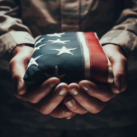 Close-up of a veteran wearing a camouflage uniform and American flag, symbolizing patriotism, military service, and sacrifice