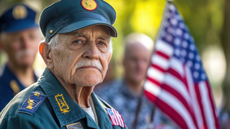 Portrait of a veteran in uniform, adorned with medals, sitting thoughtfully with the US flag nearby, Veterans, Memorial or Independence Day.
