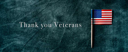 a small flag of the United States and the text thank you veterans on a dark gray surface, in a panoramic format to use as web banner or header