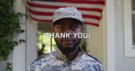 Image of thank you over african american soldier looking at camera over flag of usa. American patriotism and freedom concept digitally generated image.