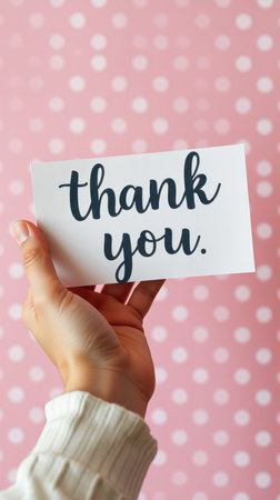 Hand holding a thank you card against a pink polka dot background in a warm and inviting setting