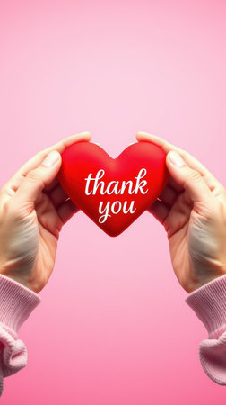 Red heart with thank you message held in hands against a pink backdrop expressing gratitude and appreciation