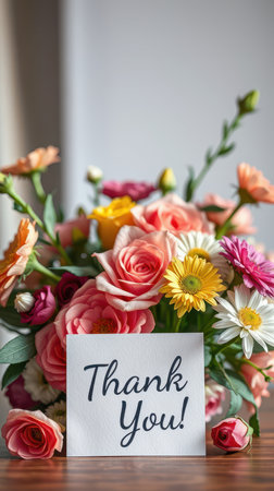 Beautiful bouquet with a thank you card on a wooden table, perfect for expressing gratitude and appreciation