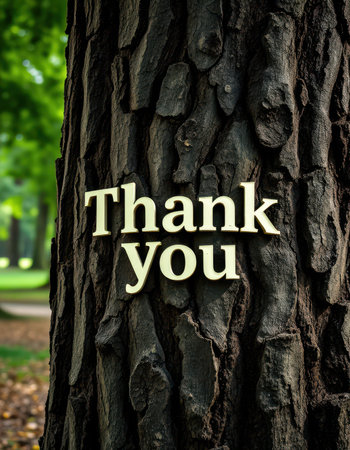 Creative thank you sign affixed to a tree in a lush green park during daytime