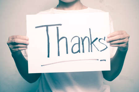 two woman hand holding paper write thanks word