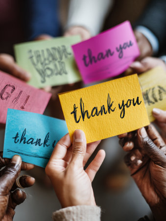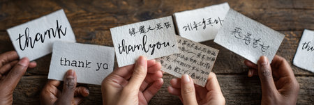 Different hands grasp thank you notes showing a variety of languages, celebrating gratitude and connection among diverse cultures.