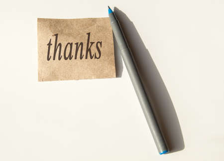 A person is writing the word thanks on a piece of paper with a pen. Concept of gratitude and appreciation