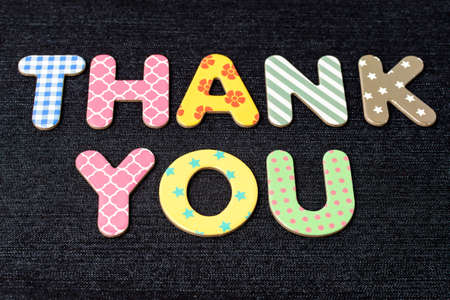Card with Thank You words made from mixed vivid colored wooden letters on a textured dark black textile material that can be used as a message