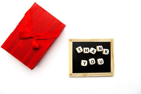 Top view of wooden cubes with thank you inscription on blackboard and gift box with ribbon.