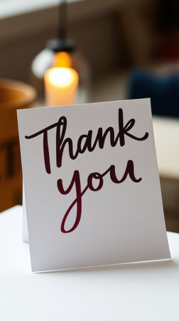 Thank you card placed elegantly on table with warm candlelight in background creating a cozy atmosphere
