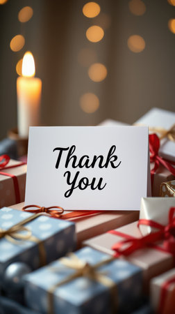 Gift-wrapped presents arranged beautifully with a thank you card and soft candlelight enhancing the festive atmosphere