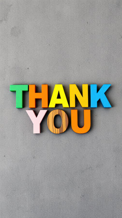 Colorful wooden letters spell out thank you on a gray surface, celebrating gratitude in a cheerful and vibrant manner