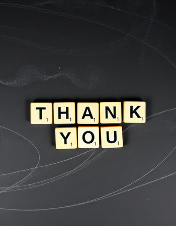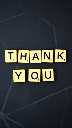 Creative arrangement of scrabble tiles spelling out a message of gratitude on a dark surface