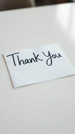 Handwritten thank you note on a clean white table in bright light conveying gratitude and warmth