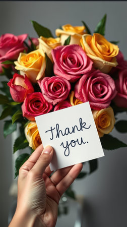 Beautiful bouquet of pink and yellow roses with a handwritten thank you note in a cozy indoor setting
