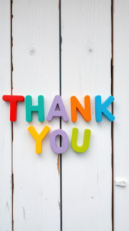 Colorful letters spelling thank you displayed against a rustic wooden background create a cheerful impression