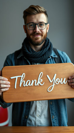 Smiling man holding a wooden sign expressing gratitude in a cozy indoor setting