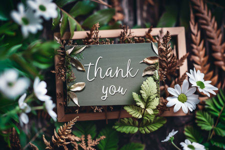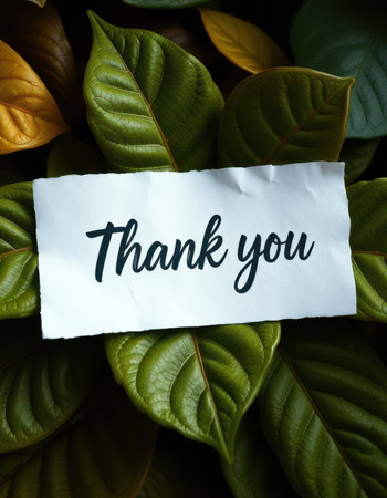 Thank you note placed on green leaves creates a calming and natural ambiance in a vibrant garden setting