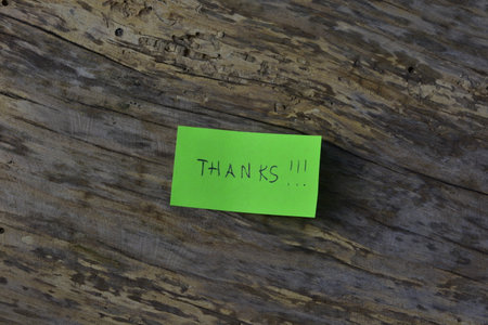 Message thanks thank you on green sticky note day on wooden board textured background