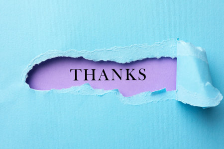 Thank You card with word on violet background, view through torn light blue paper