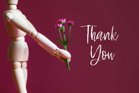 Thank you text and Wooden mannequin is holding tiny purple flowers like chrysanthemum, concept of giving flower bouquet as gratitude