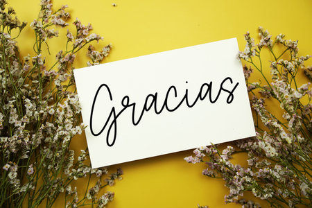 Gracias (Spanish language) text with flowers decoration on yellow background