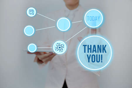 Sign displaying Thank You. Business concept a polite expression used when acknowledging a gift or service Lady Holding Tablet Pressing On Virtual Button Showing Futuristic Tech.