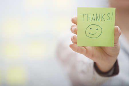 Woman holding sticky note with Thanks text