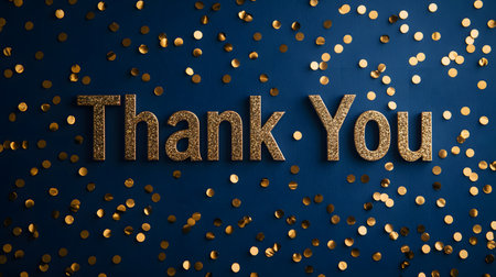 The image showcases a glittering 'Thank You' in gold letters against a deep blue backdrop, scattered gold confetti enhances its festive ambiance.