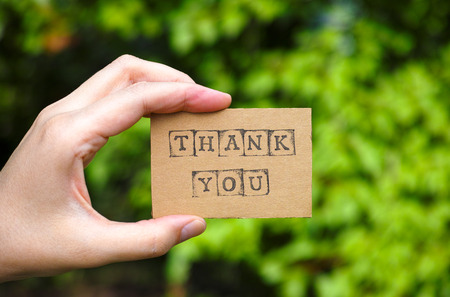 Hand holding thanks card over blur background, banner