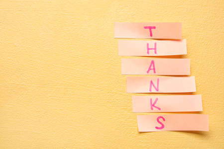 Sticky papers with word THANKS on yellow background