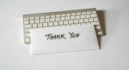 Thank you letter on top of keyboard. Isolated, white background.
