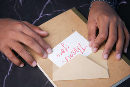 close up of man hand reading a thank you letter