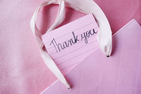 close up of thank you note on a sticky paper on pink background
