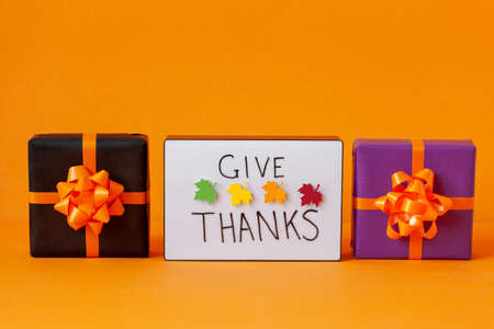 Creative balck and purple present box. Thanksgiving autumn composition on orange background. Lightbox with the phrase Give thanks. Autumn holidays, fall concept.