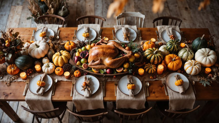 Overhead shot of a festive Thanksgiving dinner table, adorned with turkey, mashed potatoes, and pumpkin pie