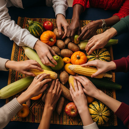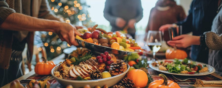 Hearty Thanksgiving meal on a farm table, family hands serving food, soft sunset background