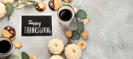 Happy thanksgiving greetings on letter board with pumpkin and autumn leaves around. Seasonal flat lay
