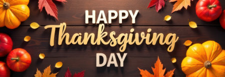 Celebrating thanksgiving day with a cheerful web banner featuring decorative pumpkins and vibrant autumn leaves artfully arranged on a rustic wooden background