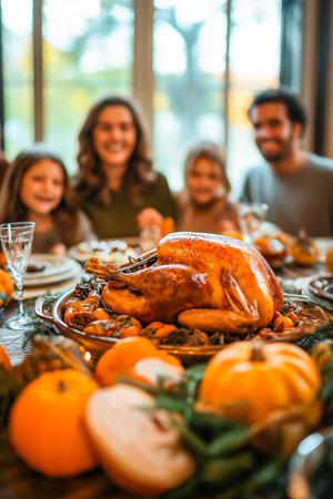 A festive turkey and pumpkins are the focus of a family gathering, celebrating the holiday season