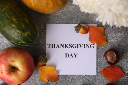 Thanksgiving day, holiday celebrations every fourth Thursday in November. Flat lay with paper card and autumn leaves on gray table